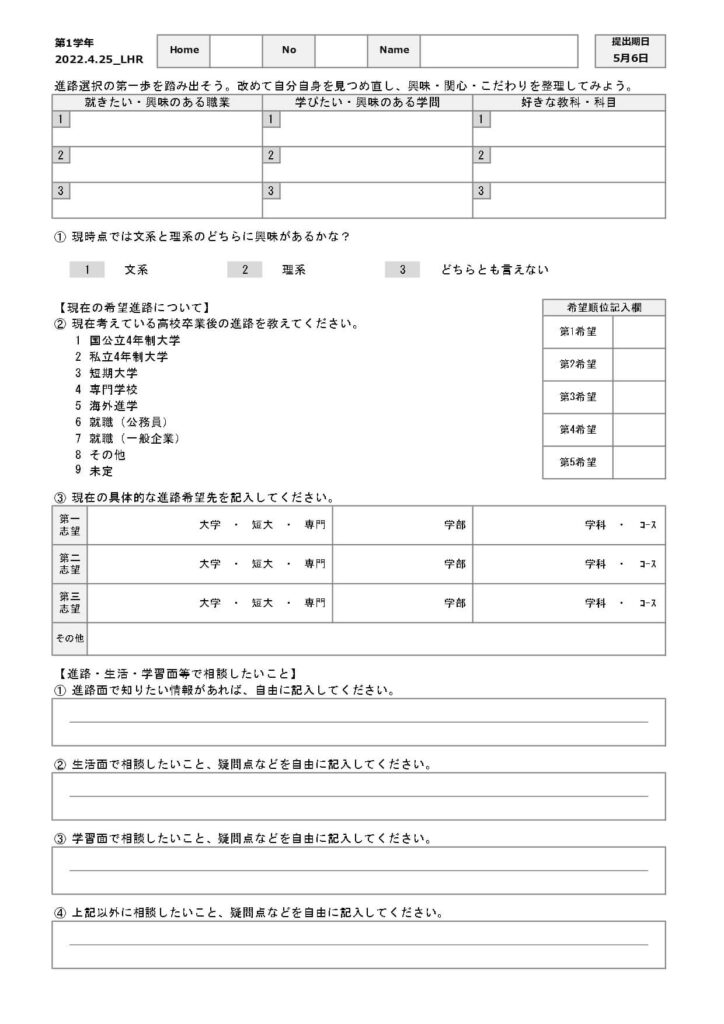 進路指導をする時は、以下のような記入シートを渡して考えさせるようにします。その時に生徒は周りと相談をするでしょう。同じようなレベルの高校や大学を目指す場合、「一緒やん!!!頑張ろう!!!」と意気投合することがあるのです。