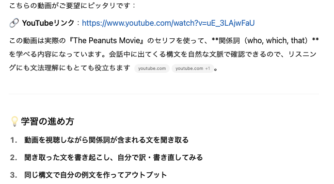 「YoutubeにあるPeanutsの動画から、関係詞が出てくるものを教えて。」と言った結果、以下のようなフィードバックがありました。